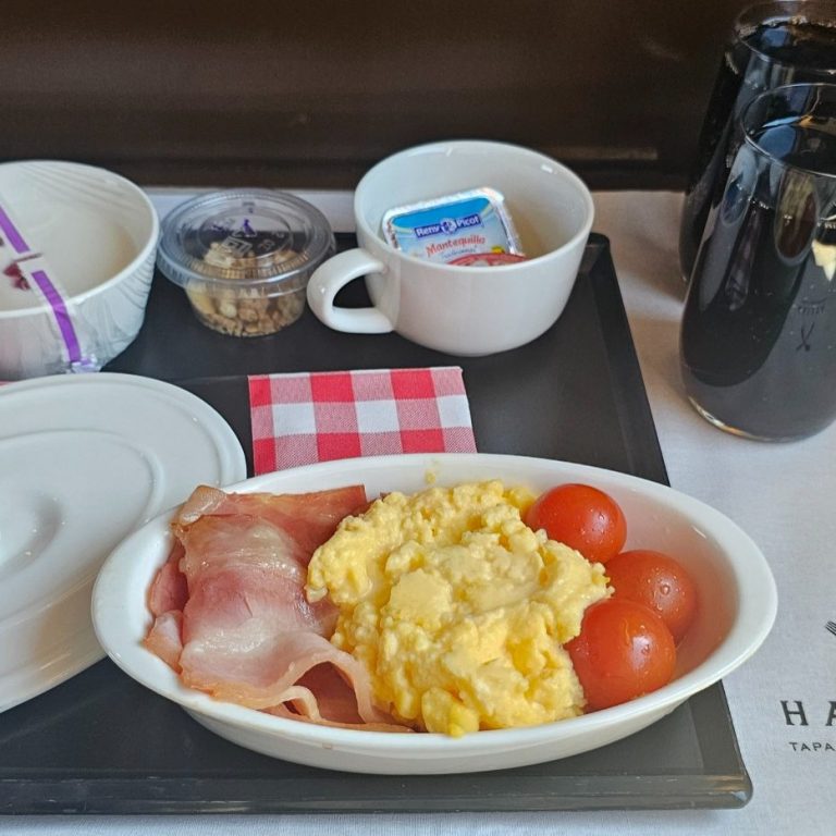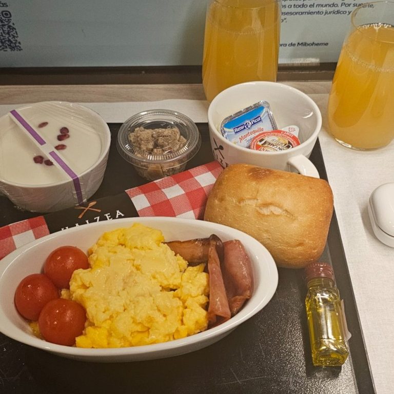 una vez se accedió al tren, ocupe mi plaza asignada en el billete, embarcaron todos los pasajeros, y a las 08:12 minutos efectuamos la salida puntual hacia nuestro primer destino, Madrid Chamartín, posteriormente después de estar pasando por el túnel de La Cabrera, en Buñol, me llego la comida que seleccione durante el proceso de reserva, en este caso. menú salado, el cual contenía, huevo revuelto, tres tomate Cherry, y tiras de beicon, acompañado de yogur y bebida a elegir entre agua zumo o refrescos y cafe o te posteriormente